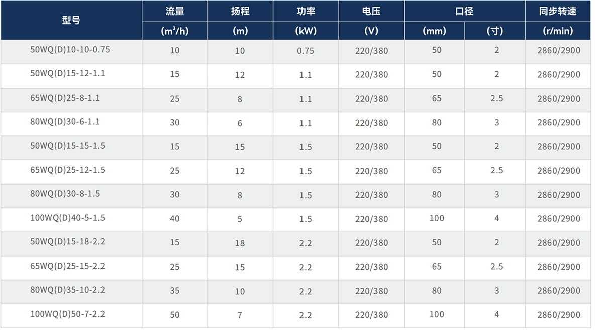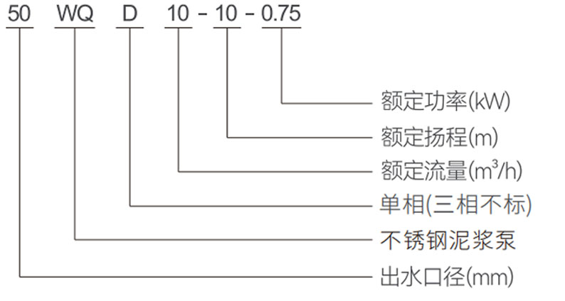 WQD型污水污物潛水電泵(以下簡稱電泵),由水泵、密封、電動(dòng)機(jī)三部分組成。電動(dòng)機(jī)位于電泵上部,為單相或三相異步電動(dòng)機(jī)。水泵和電動(dòng)機(jī)之間采用雙端面機(jī)械密封,每個(gè)固定止口密封處采用“O"形耐油橡膠封圈作靜密封。